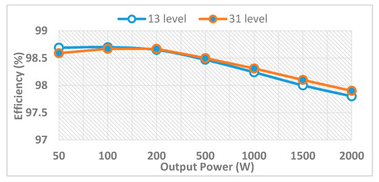 Asymmetric topologies have come into the picture for obtaining output levels in higher numbers. The proposed asymmetric topology was compared with recent SCMLIs of similar voltage levels comprehensively, which is shown in Table 4. For higher levels (here 31), this topology did not have a marked difference in the different properties given in the table. The value of in the proposed MLI wass less than the structures presented in [23,43]. The number of drivers and switch count used here was lowest. Most importantly, the same topology was used for symmetric as well as asymmetric design in the topology proposed.
