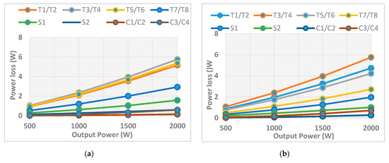 The efficiency versus output power curve for both symmetrical and asymmetrical configurations is shown in Figure 6 for a resistive load. Maximum efficiency was achieved with about 98.7% along with a 100-watt output power for both the configurations in which capacitor ripple loss had neglected. Capacitor ESR loss (conduction loss due to internal resistance of the capacitors (here 0.1 ohm is taken)) was taken in its place. Power loss distribution among different switches and capacitors are given in Figure 7 for both settings. S1 and S2 were the bidirectional switches, as shown in Figure 1. Both switches of the bidirectional switches had the same loss. All the complementary switches also had the same losses as the number of states when they were turned ON and turned OFF for a full cycle.