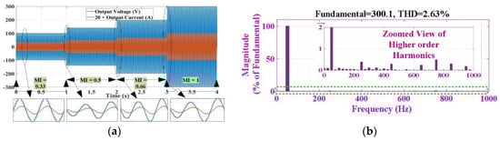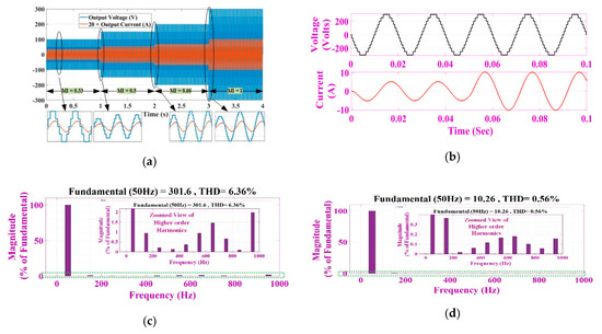 For symmetrical configuration, the magnitude of the three DC voltage sources was similar, and for simulation purposes, it was taken to be 100 volts. The resultant voltage at the output had a peak voltage of 300 V with 50-V steps and 13 levels in totality. All four capacitances were considered to be 4700 µF. The current waveform and voltage at the output for Z = 50 Ω +100 mH as the R-L load with varying MI are presented in Figure 8a. The number of levels for voltage at the output was directly proportional to the MI. At MI = 0.5, the output voltage levels were reduced by half, which can be analyzed from Figure 8a. The current waveform and voltage at the output with a load change of Z = 50 Ω +100 mH to Z=25 Ω +100 mH, which are given in Figure 8b–d, show the harmonic analysis of the voltage obtained and the current waveforms for Z = 50 Ω +100 mH, respectively. Voltage and current THD was achieved as 6.36% and 0.56%, respectively. Current THD was lower as the inductive load reduced the high-frequency current components.