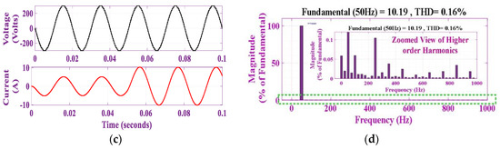 For the asymmetrical case, V1 = 240 V, V2 = 20 V, and V3 = 40 V. The resultant output waveform has a peak voltage of 300 Volts with a step size of 20 Volts. Figure 9a shows the current waveform and voltage at the output for Z = 50 Ω +100 mH as the R-L load with varying MI. Figure 9b presents the current waveform and voltage at the output with Z = 50 Ω +100 mH to Z = 25 Ω +100 mH as the change in load. Harmonic analysis for the obtained voltage and current waveforms for Z = 50 Ω +100 mH, as shown in Figure 9c,d, respectively. Voltage and current THD was obtained as 2.63% and 0.16%, respectively.