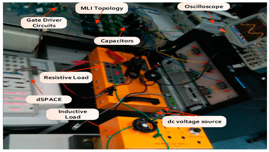 Figure 10 shows that the above results obtained were verified using an experimental prototype for both symmetrical and asymmetrical cases. Toshiba IGBT GT50J325 was taken as the switch, and the dSPACE 1104 controller was used to obtain gating pulses for these switches. Figure 11a,b shows the output voltage and current waveforms for RL load of 200 Ω +100 mH and a resistive load of 120 Ω, respectively, for the symmetrical case. In this case, V1 = V2 = V3 = 80 V was chosen. The thirteen-level output had the peak voltage of 240 V with a step voltage of 40 V. The output waveforms with load change and MI change are given in Figure 11c,d. The load change was from 120 Ω to 60 Ω, and MI change was from 0.33 to 1. The 13-level output is shown in Figure 12a. For the asymmetrical case, V1 = 240 V, V2 =20 V, and V3 = 40 V were taken. Figure 12b shows the output waveform having a load change from no load to 120 Ω to 60 Ω. Figure 12c shows the thirty-one-level output voltage with the maximum voltage of 300 volts having steps of 20 volts. The output waveform for a resistive load of 32 Ω is given in Figure 12d.