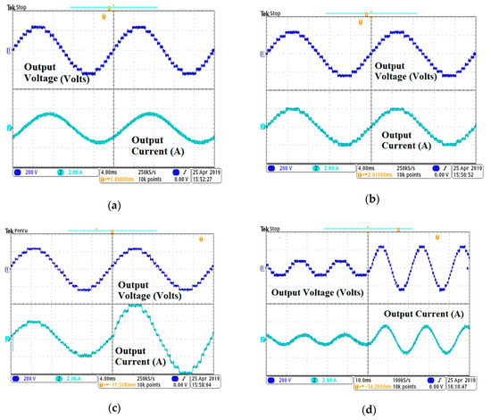 Experimental results: (a) Output voltage and current for the symmetric case with Resistive-Inductive (R-L) load; (b) output waveform with R-load; (c) output waveform with load change; (d) output waveform with Modulation Index (MI) change.