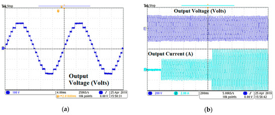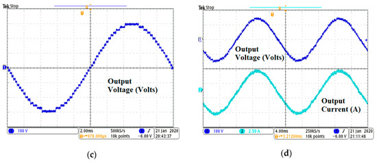 Experimental results: (a) Output voltage for the symmetrical case having 13 levels; (b) output waveform with zero, R, and half of R load; (c) output voltage for the asymmetrical case having 31 levels; (d) output waveform for the asymmetrical case for resistive load.
