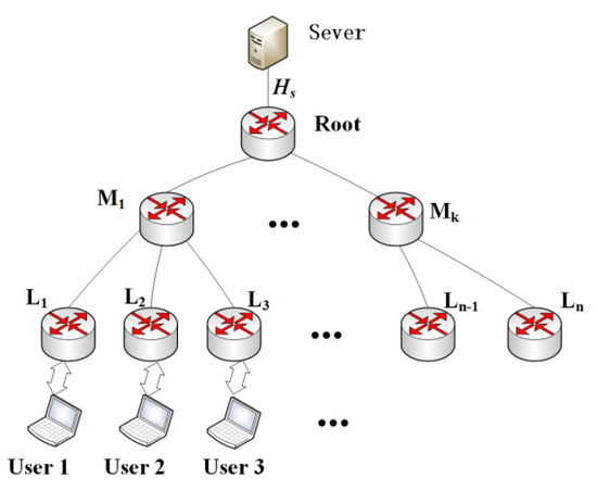 We choose the three-layer architecture to set up our model, to comprehensively analyze how topology size affects network benefit [27]. It should be noted that the ICN hierarchical topology of any number of layers still applies to the model. Figure 1 shows a three-layer hierarchical network containing one root node in the first layer connecting to one server, middle nodes (also denoted as aggregation nodes) in the second layer and leaf nodes in the third layer. The server keeps all the content permanently and is far away from users. For simplicity, all middle nodes are connected to the root node and connected to at least one leaf node. On the other hand, each leaf node only connects to one middle node. All nodes can be equipped with cache space to cache content. If a request arrives at a node that contains the requested content, the requested data will be sent from the hit node rather than from the origin server. This three-layer network can be easily extended to a larger multilayer tree topology, such as doing k-core decomposition for networks in Reference [20]. We assume that all users are connected to the leaf nodes and their requests for content will arrive at leaf nodes first.