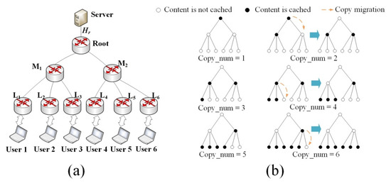 A case of placing copies of single content. (a) A three-level Cache Network System Model. (b) Multiple copy placement process of a single content.