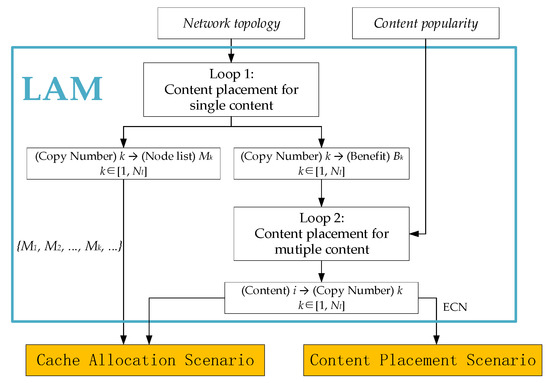 LAM is based on the above analysis. The overview of LAM is shown in Figure 3 and the detailed step is presented in Algorithm 1. The input Network_topology contains the necessary topology information, is the total cache capacity to be allocated, is the set of nodes and is the set of content. The output {, , …, } contains sets, each of which records the content copy position and the subscript is the number of copies in the network. This output can locate the nodes to place the content copy. The output records the relationship between content and its ENC in the topology. With these two output results, we can get the content placement solution, as well as the exact space to be allocated of each node.