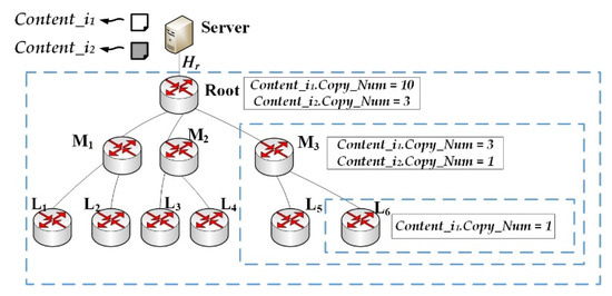 To place the first content copy, the benefits of the root node, each middle node and each leaf node are , and . As long as is larger than one hop, placing content at the root node will bring maximal benefit. To place the second content copy, we calculate the nodes bringing the highest benefit are node and . We choose to place the second copy but it is not the optimal placement solution when the number of content copies is 2. It is easy to find that if we move the copy from root node to , the network benefit will increase (3 access leaf nodes with the request arrival rate and each request hit at will reduce one hop, from to root node). The similar situation happens when the number of copies equals 4 or 6. Continue placing copies, we can get the content placement process as shown in Figure 2b.