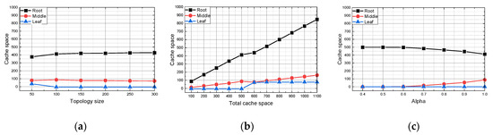 From Figure 6a, it can be observed that when topology size increases, more cache capacity is allocated to the root node, leading to the cache capacity reduction of middle and leaf nodes. This happens because when the total request number is fixed, requests become more dispersive. Each leaf node and each middle node will serve fewer requests, so placing cache space at the root node brings more benefit. It can be also found the cache capacity of leaf nodes decreases fast than middle nodes.