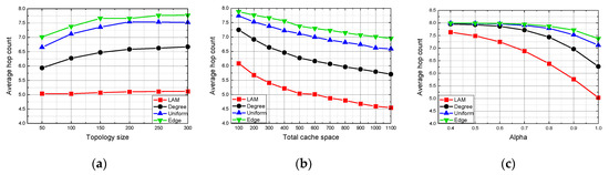 As α increases in Figure 7c, all methods get lower average hop count. With bigger α, requests become focused on content with high popularity. In this situation, more requests are served at middle nodes and edge nodes and LAM keeps the advantage over other methods.
