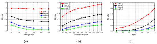 Performance of cache hit ratio in content placement. (a) The cache hit ratio under different topology sizes. (b) The cache hit ratio under different total cache space. (c) The cache hit ratio under different Zipf parameter Alpha.