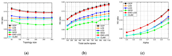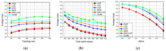 From Figure 9a, as topology size grows, average hop count from most strategies increases except CL4M. Figure 9b,c show that when total cache space or increases, the average hop count from all strategies decreases and gaps among them are stable. Compared with LCD, the average hop count of ENC-LCD is 9.96% lower. In different aspects, OCP keeps the lowest average hop count, for the reason that the content placement solution takes into account the impact of position information and content information. ENC-LCD performs a little behind OCP but is clearly ahead of other strategies. MCD performs the worst and LCD has a slight advantage over LCE and CL4M. OCP searches for the optimal placement from the perspective of the network, so lower average hop count is reached. MCD will delete the original copy when placing a new copy downstream, which reduces the content share rate and increases the average hop count.