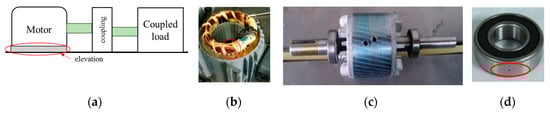 The bearing axis deviation fault happens when a motor is eccentrically coupled to its load. Improper installation, changes or damage to motor bases cause the motor shaft to misalign with the coupling load. Similar to [], an artificially created eccentricity misalignment experiment with an elevation of 0.5 mm, as illustrated in Figure 1a, is also used to simulate this fault.