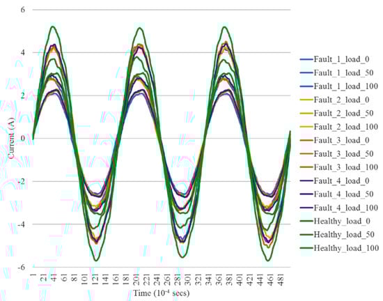 The experimental simulation of previous test motors produces a total of 3750 time series data from 150 three-second current signals of five motor conditions under five loading variations. A set of three full-cycle sample waves of current signals plotted in Figure 2 shows five motor conditions under three different motor loadings. It can be observed that the healthy motor upper-bounded all other fault-conditioned motors in terms of current magnitude in all three motor loadings. This may be because healthy motors have less energy dissipation than faulty motors.