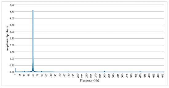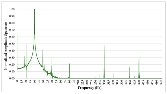 Fast Fourier transform (FFT) is simply an algorithm that performs DFT []. With the previously generated time series motor current signals, FFT is used to transform these into frequency spectra. An example of a frequency spectrum of a healthy motor signal is shown in Figure 3. FFT is performed using SciPy library [] to convert the time series data into the frequency spectrum. Three data preprocessing techniques are performed to avoid potential noise and to ease the learning process of the proposed fault classification system.