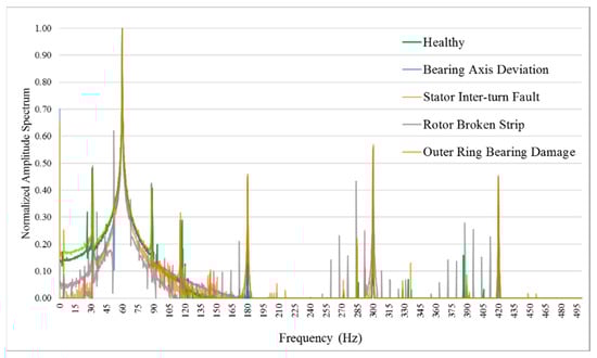 The presence of other frequencies with noticeable amplitudes is often believed to have been caused by motor faults. Identifying these frequencies for each motor fault type is most likely difficult due to the complex frequency spectra, as perceived in Figure 5. Accordingly, differences among five motor conditions can be observed, but these seem difficult to distinguish simply by using human visual recognition.
