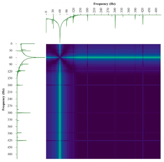 First, data clipping helps truncate the converted data within the 0–500 Hz range. It was assumed here that all motor faults would not operate beyond 500 Hz. Increasing the frequency range decreases the FOP image resolution, which may give a poor CNN classification performance. Second, a 90% percentile clipping is performed to change the magnitude of less significant frequencies into zero, thus avoiding possible noise. Finally, the magnitude of the operating frequency (60 Hz) and its side band frequencies (around 59–61 Hz) are far greater than the other modal frequencies; thus, a log function normalization is performed. Figure 4 plots a sample of a pre-processed healthy motor condition dataset of frequency spectra.