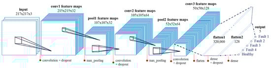 The architecture of the employed sequential-based CNN is shown in Figure 7. The CNN model initially inputs three extracted color images from the original FOP. It has various stages such as convolution, max pooling, dense, flatten, and dropout that lead to its final fault classification. Convolution layers use a filter matrix to obtain convolved feature maps by performing convolution operations over an array of input image pixels. On the other hand, the max pooling layer applies a moving two-dimensional window to the incoming matrix and outputs its maximum value to down-sample it, reduce its dimension and generalize its internal feature. We use a 2 × 2 window for two max pool layers, thus reducing their output by half. The dense layer is simply a linear operation where each input is connected to every output with weights. The first dense layer has a huge number of output units, so dropout was performed. Flattening, which is simply a method of linearizing a two-dimensional array, was also used. Dropout is a popular and well-known regularization technique that reduces the risk of overfitting. It is applied and tuned in different values per layer. Finally, another dense layer is added, which serves as its output layer. Here, five output units represent five motor conditions.