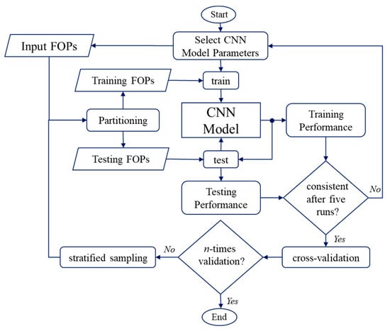 Simultaneously, the FOPs generated from the previous section are split into training and testing datasets. Using the selected model parameters, model training is first performed by learning the patterns and features from the training FOPs and evaluating their training performance. Then, another set of FOPs, also called testing FOPs, test the trained CNN model, and evaluate its testing performance. In the third stage, a comparison between training and testing performances is performed to observe the presence of overfitting.