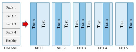 Testing datasets are used to evaluate the same model chosen from the previous step. To avoid model bias, each testing dataset is completely different from its training dataset. After testing, the testing performance is compared with the previous training performance. This is repeated via fivefold cross-validation with stratified sampling data partition, as shown in Figure 9.