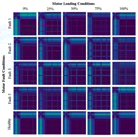 Figure 10 shows a matrix of FOPs where all five motor fault conditions under five different loading conditions are compared. A motor operating frequency of 60 Hz with its sidebands is noticeable in all graphs, since all test motors have identical specifications. The healthy motor seems to have the clearest plots, while the rotor coil turn-to-turn and outer ring bearing damage faults tends to share similar messy plots. In addition, it can be observed that there are variations in the occurrence plots for each motor fault condition under different motor loadings. For example, the healthy motor tends to have a clearer plot when it is under no load or a full load. Similar observations can be made for bearing axis misalignment (Fault 1). Motors with other fault conditions tend to be messy at any loading condition. A smoother plot is expected for the healthy motor condition.