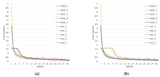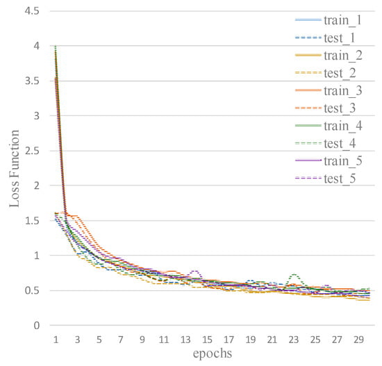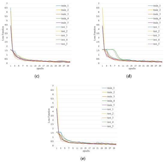 Five train–test categorical cross entropy (CCE) loss function graphs (a–e) of five motor loading conditions, respectively, with five train–test runs of cross-validation.