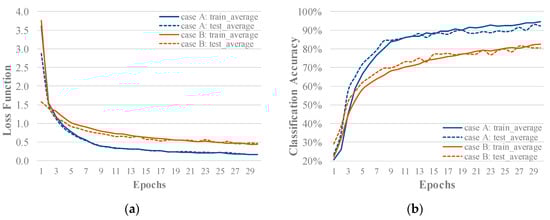 (a) An average loss function graph of two FOP-CNN case models when motor loading condition is used (Case A), and when it is not (Case B); (b) an average classification graph of two FOP-CNN case models when motor loading condition is used (Case A), and when it is not (Case B).