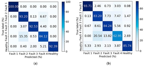 (a) Confusion matrix performance of FOP-CNN when motor load condition is used as an input label; and (b) confusion matrix performance when motor load condition is not used.
