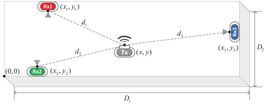 In Figure 1, the localization aims to determine the unknown position of Tx, i.e., , based on a set of measurements at three Rx’s, namely, Rx-1, Rx-2, and Rx-3. Usually, the basic localization techniques consist of two main steps: