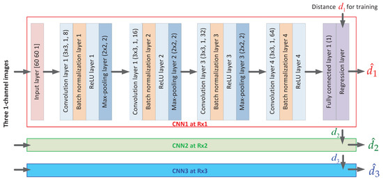 As stated, one CNN is required for each Rx for the CNN-DE. The structure of one CNN of three for CNN-DE is shown in Figure 3. The CNN consists of four convolutional layers for feature extraction and a fully connected layer for ranging followed by one regression layer. The output of CNN is the distance between a Tx and one of three Rx’s.