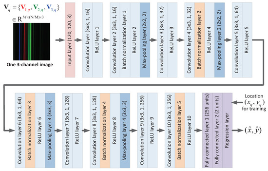 The CNN structure used in CNN-LE is designed as shown in Figure 5. The designed CNN includes ten convolutional layers with 3 convolutional filters and stride one for all filters. The number of channels for the filters are 16, 16, 32, 32, 64, 64, 128, 128, 256, and 256, respectively. The size of the filter, the number of strides, and the number of channels are denoted sequentially in the parenthesis, e.g., for the first convolution layer. As an activation function, the rectified linear unit (ReLU) layers are followed by the first, third, fifth, seventh, and ninth convolution layers. For the second, fourth, sixth, eighth, and tenth convolution layers, the batch normalization layers are included between the convolution and ReLU layers. The max-pooling layers are after the second, fourth, sixth, and eighth ReLU layers for down-sampling the convolutional layer output. The first and second pooling layers have a pool each with stride two, whereas the third and fourth pooling layers have a pool each with stride three, which are denoted sequentially in the parenthesis, e.g., (2 × 2, 2) for the first max-pooling layer. After the last ReLU layer, i.e., the tenth ReLU layer, two fully connected layers with the 256 and 2 units (outputs), respectively, are included to generate two inputs of regression layers to estimates of x and y. A regression layer is located at the last of the network to compute the loss by comparing the ground truth of location, i.e., , of the training data and the output of the fully connected layer 2, where the loss is defined as a half-mean-squared-error as follows [26]: