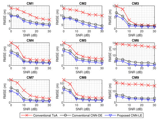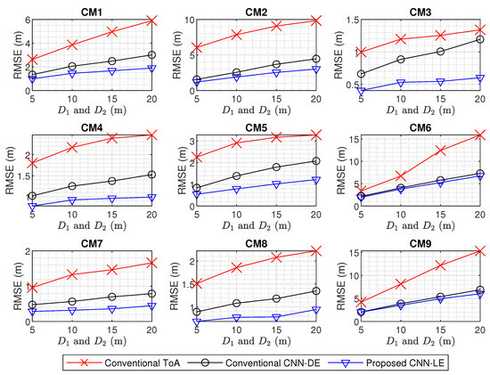 Considering that the localization methods for the UWB system mainly operate in indoor environments, SNR in this simulation is reasonable. Figure 9 illustrates the RMSE of the compared systems, namely ToA-based, CNN-DE, and the proposed CNN-LE method. Generally, the RMSE increases as the size of the area increases for all methods and CMs. The increase in the RMSE is expected because a larger average distance between Tx and each Rx results in a larger path loss. Correspondingly, increasing the area of localization yields a similar effect as decreasing the SNR.