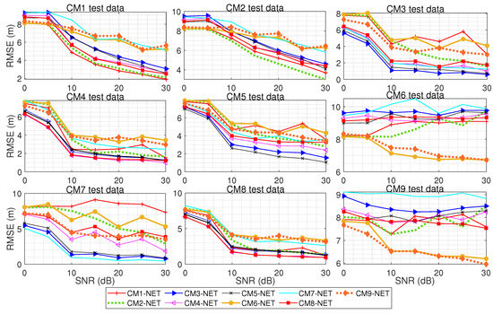 RMSE (y-axis) across SNR (x-axis). CM#-NET is a CNN that is trained by using data generated under CM# model. CM#-NET is tested with various CMs.