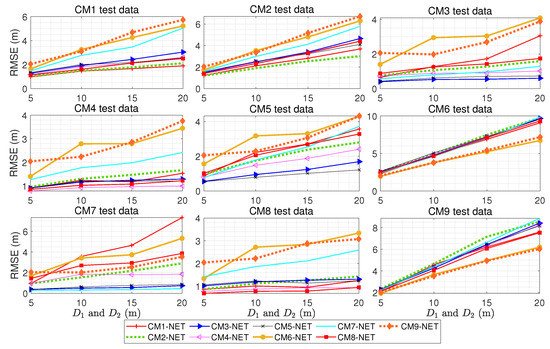 Figure 12 shows the RMSEs of each CM#-NET when a CM#-NET is applied to each CM test data with respect to for each area size. Similar to the results presented in Section 4.1, the CM#-NETs trained in indoor and outdoor CMs work well in other indoor and outdoor models, respectively. Therefore, a reduction in the learning time can be expected by implementing a transfer learning method.