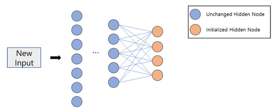 Transfer learning is usually adopted when solving a related problem with an existing model. We believe that the UWB NLOS identification problem at different places can be considered as an example. When the signal measuring place changes, it can be implied that the problem has also changed with environmental noise. However, it can also be implied that the two problems are related to each other because they have common obstacles. We want to identify the UWB NLOS condition in an unmeasured environment with the existing “trained model” for speed and accuracy. To apply the transfer learning concept to our proposed classifiers, we selected a weight initialization method called fine-tuning, as shown in Figure 3. The weight gradients of the last hidden layer are initialized to zero and retrain the neural network with a few unmeasured environment data. While the neural network is recovering weight gradients, the characteristics of unmeasured environment data are reflected in the neural network. Because only the last layer of weight gradients is initialized, the training requires a relatively small amount of data and time. When applying transfer learning to an MLP, it is necessary to set some hidden layers as non-trainable layers to maintain the previous knowledge.