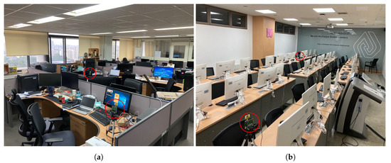 Two rooms in Paldal Hall, Ajou University, used for measuring the UWB channel. (a) Laboratory located on the ninth floor of the building; (b) classroom located on the third floor.