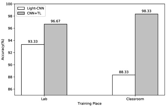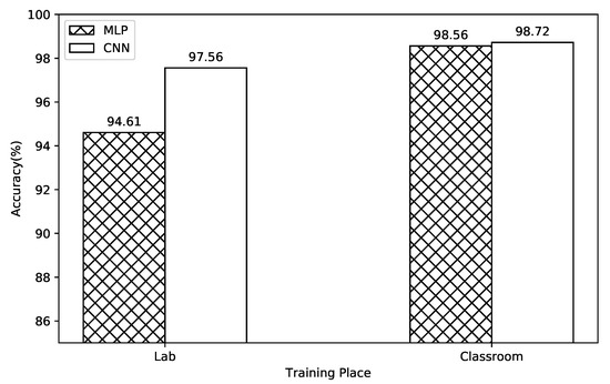 Figure 6 compares the classification accuracy of the MLP, CNN, transfer learning to MLP, and transfer learning to CNN in an unmeasured environment. Classification models without transfer learning show significantly degraded accuracy in an unmeasured environment. Compared to the trained place experiment, the accuracy decreased by more than 50% in all cases. This is because environmental noise in each place is learned together during the training process. When transfer learning is applied, the classification accuracy increases up to 98%, which is almost the same as that of the measured environment. This result verifies that transfer learning can effectively eliminate the environmental noise contained in the existing model. When comparing the accuracy of transfer learning to the MLP and CNN, the CNN shows higher accuracy in every place. This shows that the feature extraction process is also crucial in transfer learning. Comparing the accuracy of transfer learning to MLP in different places, it can be seen that the classroom has a 15% higher accuracy than the lab. We deduce from this that transfer learning requires a feature extraction process in a complex environment. MLP shows higher accuracy without transfer learning in an unmeasured environment. This is because many environmental noises were included in the model during the CNN feature extraction process.