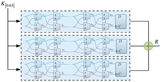 The XPUF, as introduced in [11], comprises of multiple APUFs (also known as components or streams). APUFs are delay-based silicon PUFs introduced in [8]. An APUF’s response is determined by the delay difference between the signals through two symmetric paths, as shown in Figure 1. The two signals race through a sequence of K stages, each consisting of two multiplexers (MUXes) [6,22]. At each stage, the paths traveled by the two signals, straight or crossing, depends on the value of the challenge bit. The delays that are introduced by different gates are different and, hence, different paths traveled by the signals lead to different arrival times at the arbiter. The arbiter determines the final output to be either 0 or 1. That is, if the signal on the top path arrives first, then the arbiter output would be 1; otherwise, the output is 0. The delay differences of the two signals were studied in order to satisfy the so-called Additive Delay Model (ADM) [13], which stipulates that the delay of a signal at the arbiter is the summation of delays at all gates traveled by this signal. An n-XPUF consists of n APUFs or streams, as shown in Figure 2, which illustrates a 64-bit 3-XPUF. The outputs of all APUFs are XORed in order to produce the response of the XPUF.