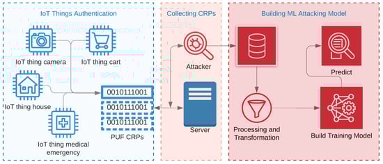 Figure 3 shows a high-level process of breaking the PUFs using ML attacks [2,11]. As shown in the figure, PUFs can be inducted in various IoT devices for authentication purposes. It can be embedded in carts, cameras, medical components, radio-frequency identifications chips, and credit cards. When IoTs communicate with their corresponding servers in order to process a PUF-based authentication, a meddling attacker can collect enough CRPs for malicious purposes. The collected CRPs can then be used as training data in order to build an ML attacking model. The number of CRPs needed by any attacking method depends on the PUFs’ complexity as well as the model being used. For example, the studies showed that APUFs can be broken, even with half the number of CRPs than what is needed for breaking the 3-XPUFs [25,26].