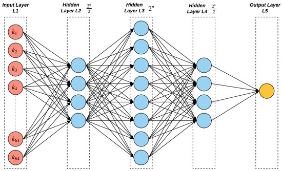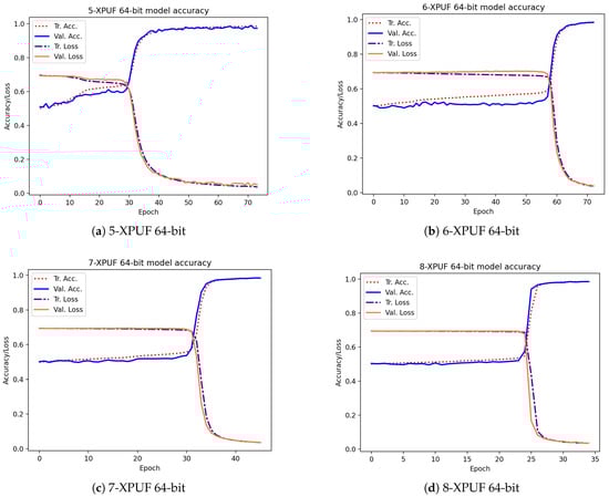 The MLP in [19] has three hidden layers for different XPUFs that range from four to eight streams with neurons in each hidden layer, where n is the number of component APUFs in an n-XPUF. On the other hand, Reference [17] used a different number of hidden layers for different XPUFs with components ranging from two to six. In [17], their MLP architecture for the 64-bit 6-XPUF has five hidden layers with 230 neurons in each hidden layer, which took about 20 min of training time for 64-bit 6-XPUFs, longer than the 7.4 min reported in [19].