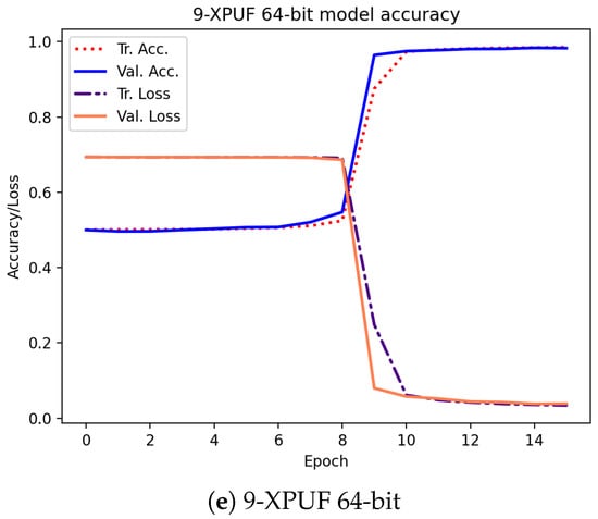 Table 3 shows the attacking results on simulated CRPs for our method (indicated by E) and the results from methods in other studies. The column Tr. CRPs in the table contains the number of CRPs used in training, and the column Tr. Time is the average training time for breaking an XPUF with PUF parameters being given in columns 1 and 2. The other methods we compared our method against include that of Tobisch & Becker [20] (indicated by A), Ruhrmair et al. [15] (indicated by B), Aseeri et al. [19] (indicated by C), and Santikellur et al. [17] (indicated by D). Please note that none of the prior research achieved a high attacking accuracy with a 100% success rate for 9-XPUF (Method A has a success rate of 25%, as shown by Table 2 shown in [20]). Among all the listed methods, Method B reported the smallest size of trained CRPs, but their training time was relatively large. Method A employs parallel computing with 16 cores, and the training times of Method A listed in Table 3 were multiplied by 16 of those in [20] in order to be consistent with the sequential training times by others. We were able to break the 5-XPUFs and 6-XPUFs with CRP sizes that were less than those needed by Methods A, C, and D while being close to those needed by Method B, but our method incurs much shorter training times. Method C was reported to be applied n-XPUF with n up to 8 and the maximum n for Methods B and D was 6. Accordingly, for large n, Method A and E were applied to 8-XPUFs and 9-XPUFs. Our method converges with 680K CRPs for 7-XPUFs, 1.7 million CRPS for 8-XPUFs, and a very low number of 4.2 million CRPs for 9-XPUFs as compared with that needed by Method A. Additionally, it is worth mentioning that, for each CRP set of 4.2 million we tested and for each of the 5 runs, our method successfully broke the 9-XPUF, a 100% success rate, while Method A has a 25% success rate with 250 million CRPs. We also plotted the average loss function values and average accuracies of training and validation in the training process in Figure 5. The losses and accuracies were plotted over the epochs for the XPUFs, with XOR size ranging from 5 to 9.