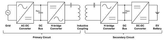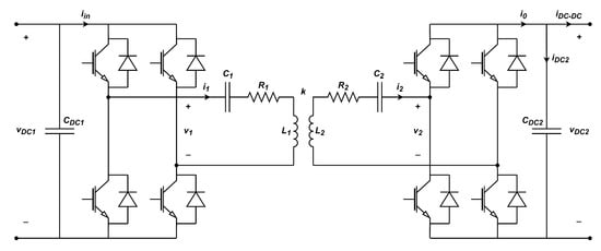 Figure 1 shows the proposed configuration of the IPT system featuring an SS compensation topology. The key elements are two weakly coupled windings, known as primary and secondary coils, along with various power electronic converters that are devoted to control the bidirectional energy flow between the grid and the EV. The main difference between this scheme and a unidirectional IPT system is that all the power converters are bidirectional, and they can, therefore, operate either as inverters or rectifiers. Furthermore, in this work, a DC–DC converter is proposed to control the current through the battery: unlike other works that connect the battery directly to the output of the H-bridge converter on the secondary side [27], the use of a DC–DC converter is adopted, as this solution adapts the voltage levels of the H-bridge converter and the battery, offering, thus, an additional degree of freedom and eliminating from the control platform extra communication devices used to transmit the information of the power flow that exists between both sides of the IPT system [28].