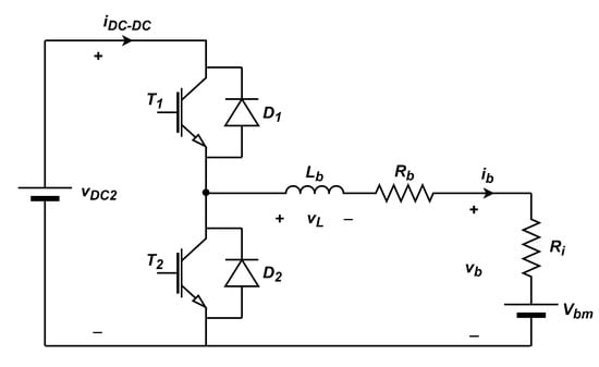 As explained before, the input voltage of the DC–DC converter is kept constant by controlling the phase-shift angle of the output voltage of the H-bridge converter on the primary side. In accordance with [28], the IPT system with SS compensation can, therefore, be approximated by a constant voltage source. The topology of this DC–DC converter is a bidirectional step-down converter and must deal with the control of the current injected/extracted into/from the battery of the EV. Figure 5 shows the scheme of the DC–DC converter with the constant voltage source , where and are the inductance and the resistance, respectively, of the filter employed to connect the converter to the battery, is the current that flows through the battery and is the battery voltage. The model of the battery used in this work employs a voltage source , which represents the electromotive force, and an internal series resistance [32].