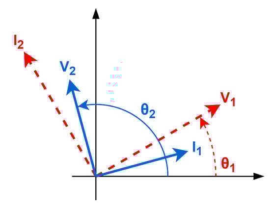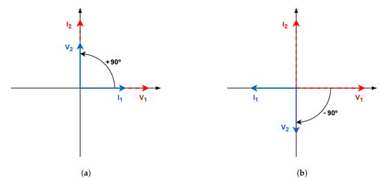 In accordance with Equation (12), the voltage phasor has a phase lead of 90° with regard to the current phasor . Similarly, the current phasor has also a 90° phase lead with regard to the voltage phasor , according to (13). These phase leads are plotted in Figure 6: