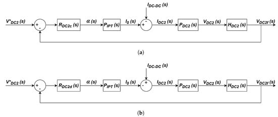 The control subsystem of the DC voltage across the capacitor is in charge of maintaining this voltage constant. It should be recalled that this action is carried out by regulating the phase-shift angle of the input voltage of the H-bridge converter placed on the primary side. Figure 8 shows the proposed closed-loop schemes of this control subsystem: The overall subsystem is split into two schemes, a first scheme designed to operate in G2V mode (see Figure 8a), and an additional structure tailored to work in V2G mode, as shown in Figure 8b. In the schemes of Figure 8, all the variables are defined in the Laplace domain, where is the reference voltage of the DC voltage across the capacitor , ; is the current through the capacitor , and the input current of the DC–DC step-down converter is . Finally, the voltage is filtered by using a low-pass first-order filter with unity static gain in order to remove the harmonics caused by the commutation process, yielding . Furthermore, the transfer function models the SS compensation topology and is the transfer function between the voltage and the current through the capacitor . Finally, and are the transfer functions of the controllers when the system operates in the G2V mode and in the V2G mode, respectively.