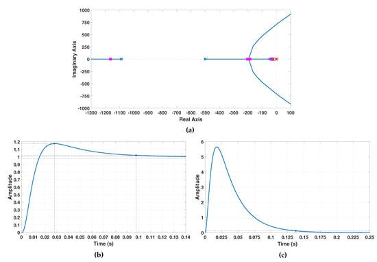 The most relevant features obtained with the design of are plotted in Figure 10. Figure 10a shows the location of the poles of the resulting closed-loop system for the control of the voltage : All the poles are located on the left-hand side of the complex plane, which implies that the closed-loop system is stable. Moreover, Table 2 shows the detailed values of these poles, in which the dominant pole is and the influence that the remaining poles have on the time response can be ignored.