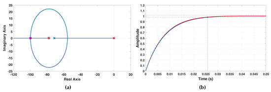 The main results obtained with the regulator are plotted in Figure 11, showing that the design specifications are fulfilled. The locations of the closed-loop poles are shown in Figure 11a: The poles are placed at −100 rad/s. Moreover, Figure 11b plots in blue the time response of the resulting closed-loop system without considering the filter , and the time response obtained when is included in the closed-loop system (red). As Figure 11b shows, both time responses are very similar, which implies that the assumption of neglecting the filter dynamics is correctly done. Furthermore, there is no overshoot in the time response, whereas the 2%-settling time is, approximately, 25 ms. This time response is much faster than that of the battery charge, which typically goes on for several hours.