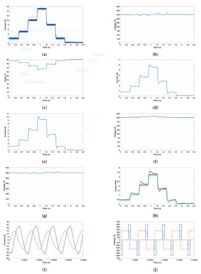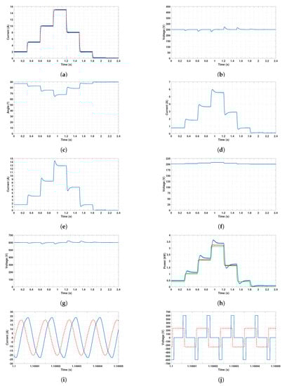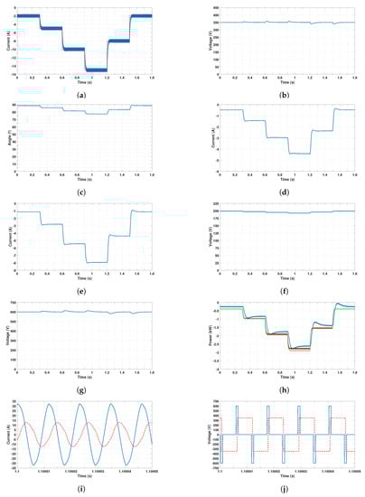 Results obtained for the V2G mode when . Time responses of: (a) the battery current (blue) and the reference (red); (b) the DC voltage ; (c) the phase-shift angle ; (d) the current ; (e) the current ; (f) the voltage of the battery ; (g) the DC voltage ; (h) the grid power (blue), the power at the input of the DC–DC converter (red) and the battery power (green); (i) currents of the compensated magnetic coupler (blue), and (red); (j) voltages across the compensated magnetic coupler (blue), and (red).