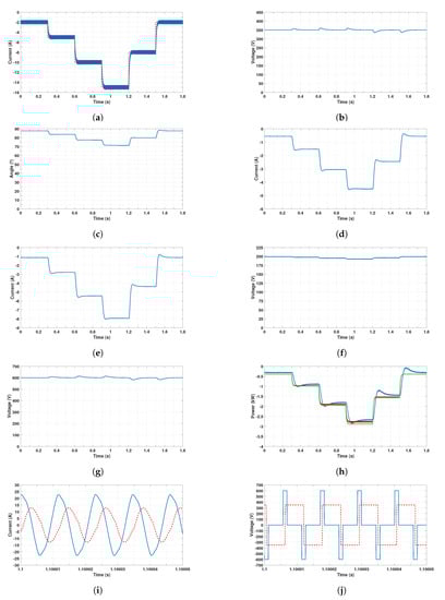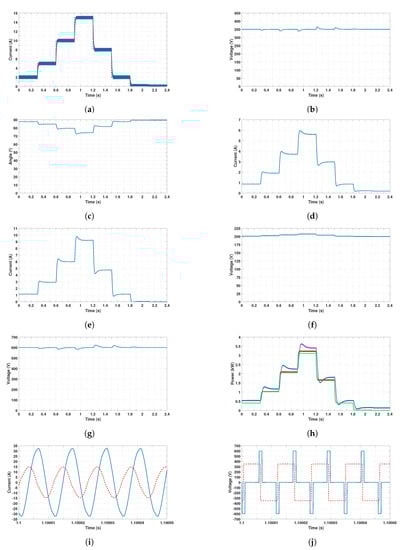 Results obtained for the G2V mode when and V. Time responses of: (a) the battery current (blue) and the reference (red); (b) the DC voltage ; (c) the phase-shift angle ; (d) the current ; (e) the current ; (f) the voltage of the battery ; (g) the DC voltage ; (h) the grid power (blue), the power at the input of the DC–DC converter (red) and the battery power (green); (i) currents of the compensated magnetic coupler (blue), and (red); (j) voltages across the compensated magnetic coupler (blue), and (red).