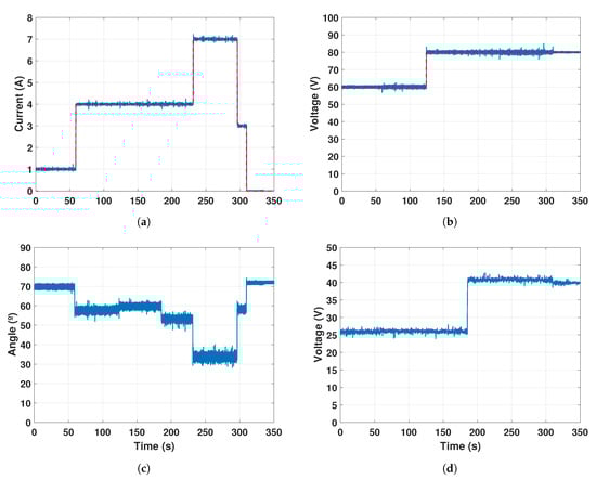 Experimental results. Time responses of: (a) the battery current (blue) and the reference (red); (b) the voltage (blue) and the reference (red); (c) the regulation of the phase-shift angle carried out by the regulator ; (d) the voltage of the battery .