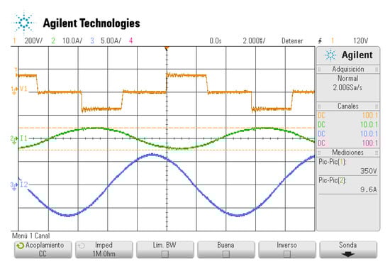 Finally, Figure 19 plots the currents through the compensated magnetic coupler and . These waveforms are almost sinusoidal. Figure 19 also shows the output voltage of the H-bridge converter, in which the phase-shift angle can be observed.